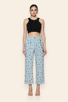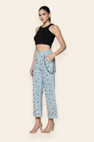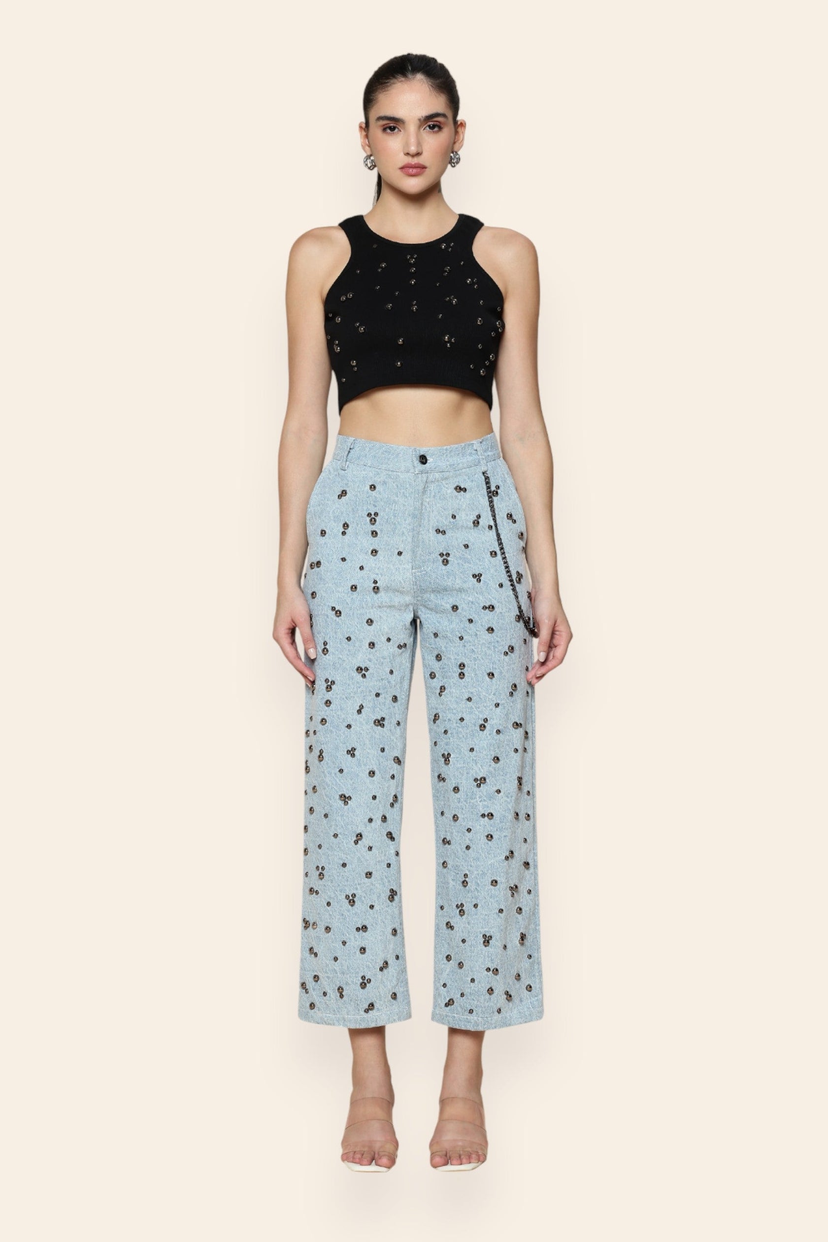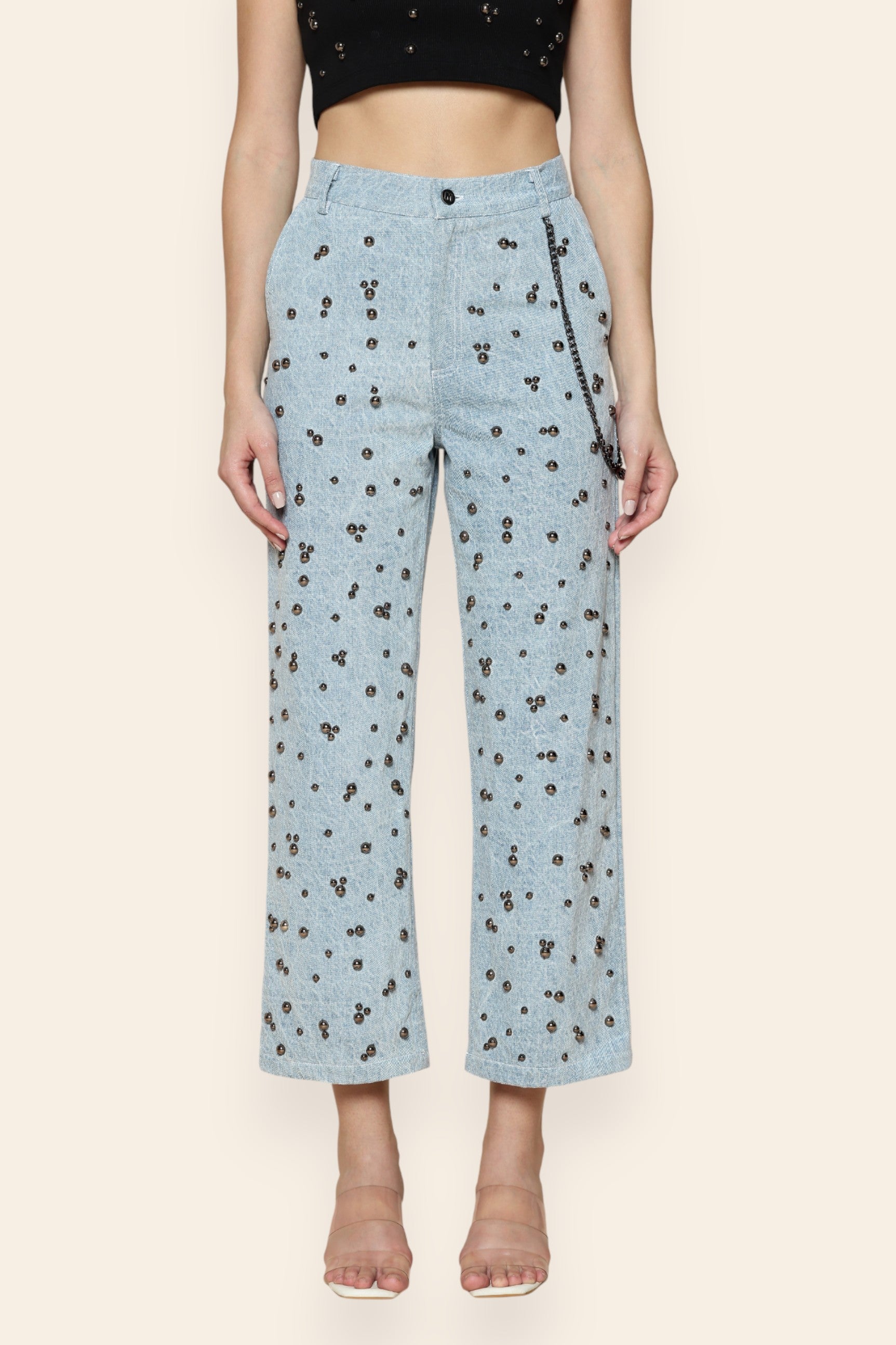 Bold and unapologetically stylish, these washed denim pants redefine contemporary edge with striking stud embellishments and sleek chain details. The structured yet comfortable fit flatters every silhouette, while the distressed finish adds a touch of rugged charm. Perfect for evening outings, concerts, or statement street-style moments, these pants exude effortless confidence and modern allure in every step.