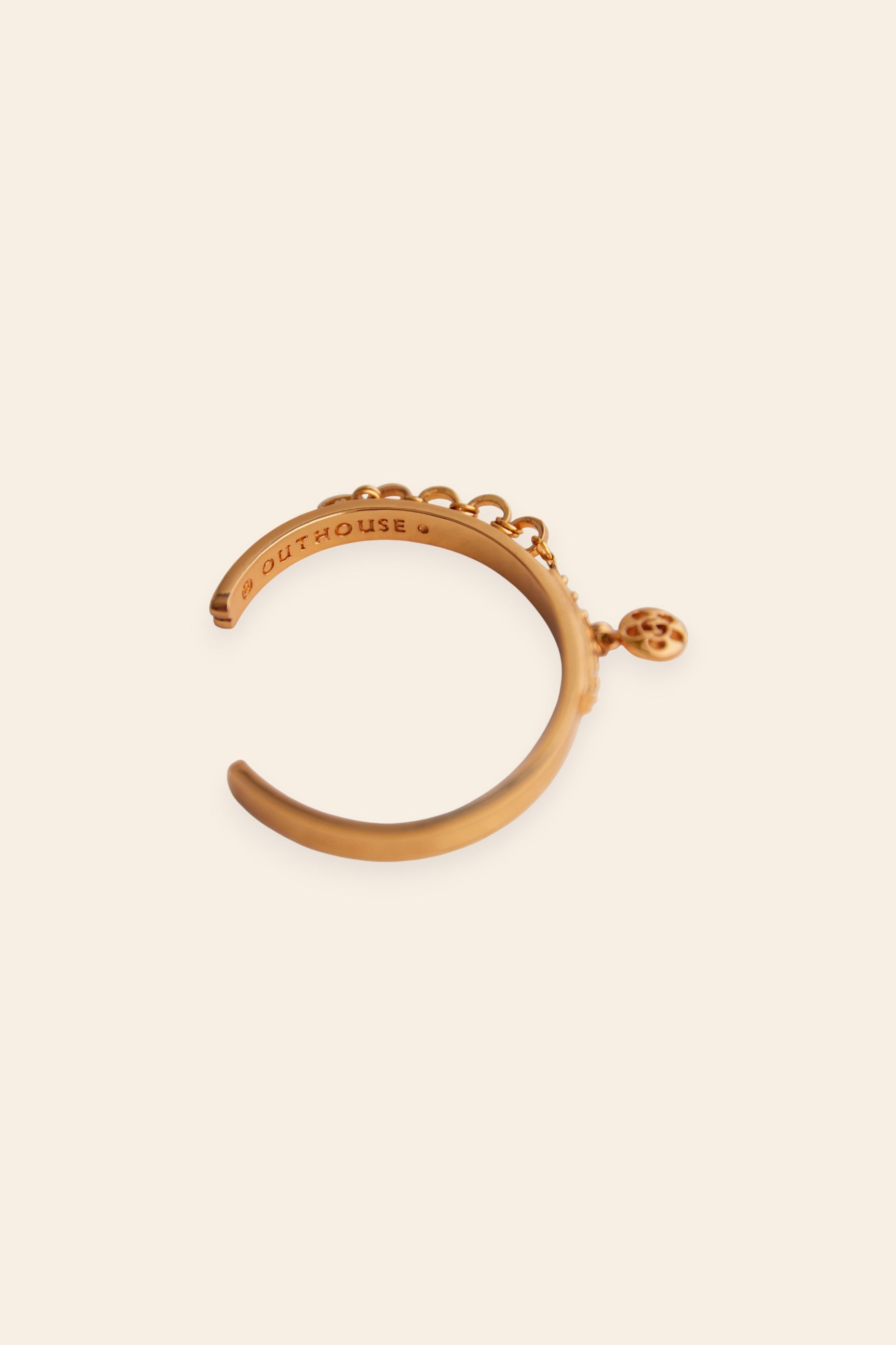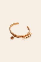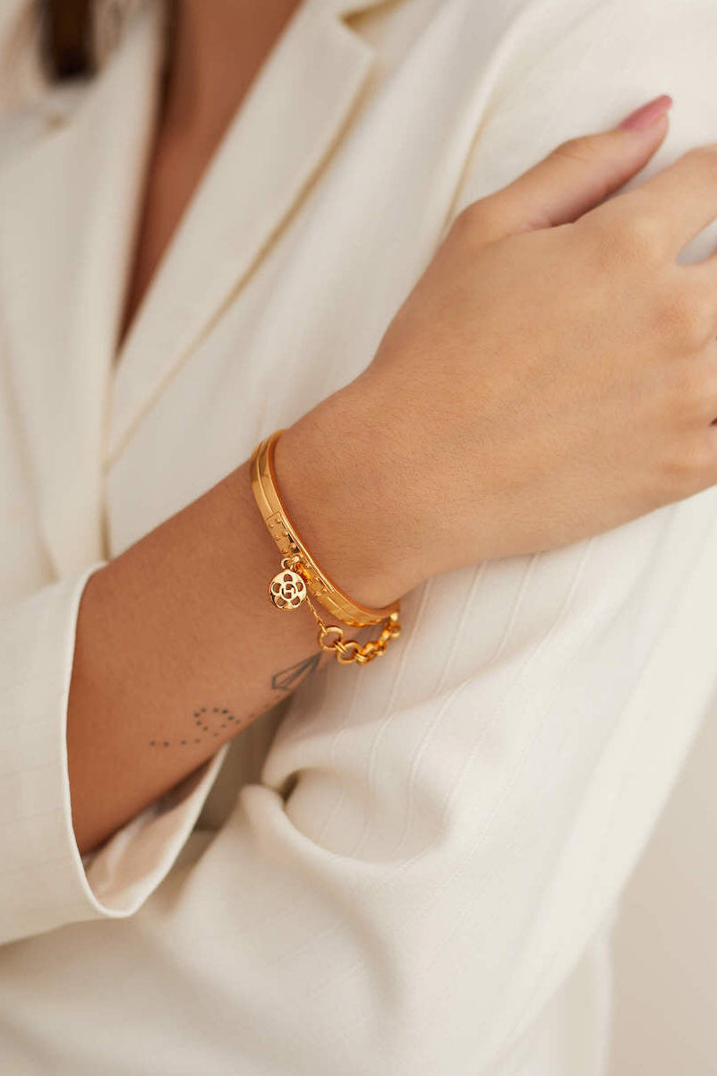 Design brilliance takes center stage with the effortless oh petite poppi handcuff, where the floral monogram floats in poetic motion, finished in radiant 22k gold. Its linked chain detail balances strength and softness, elevating structure with style, while pairing beautifully with a classic timepiece for a look of maximum impact that stops time itself.