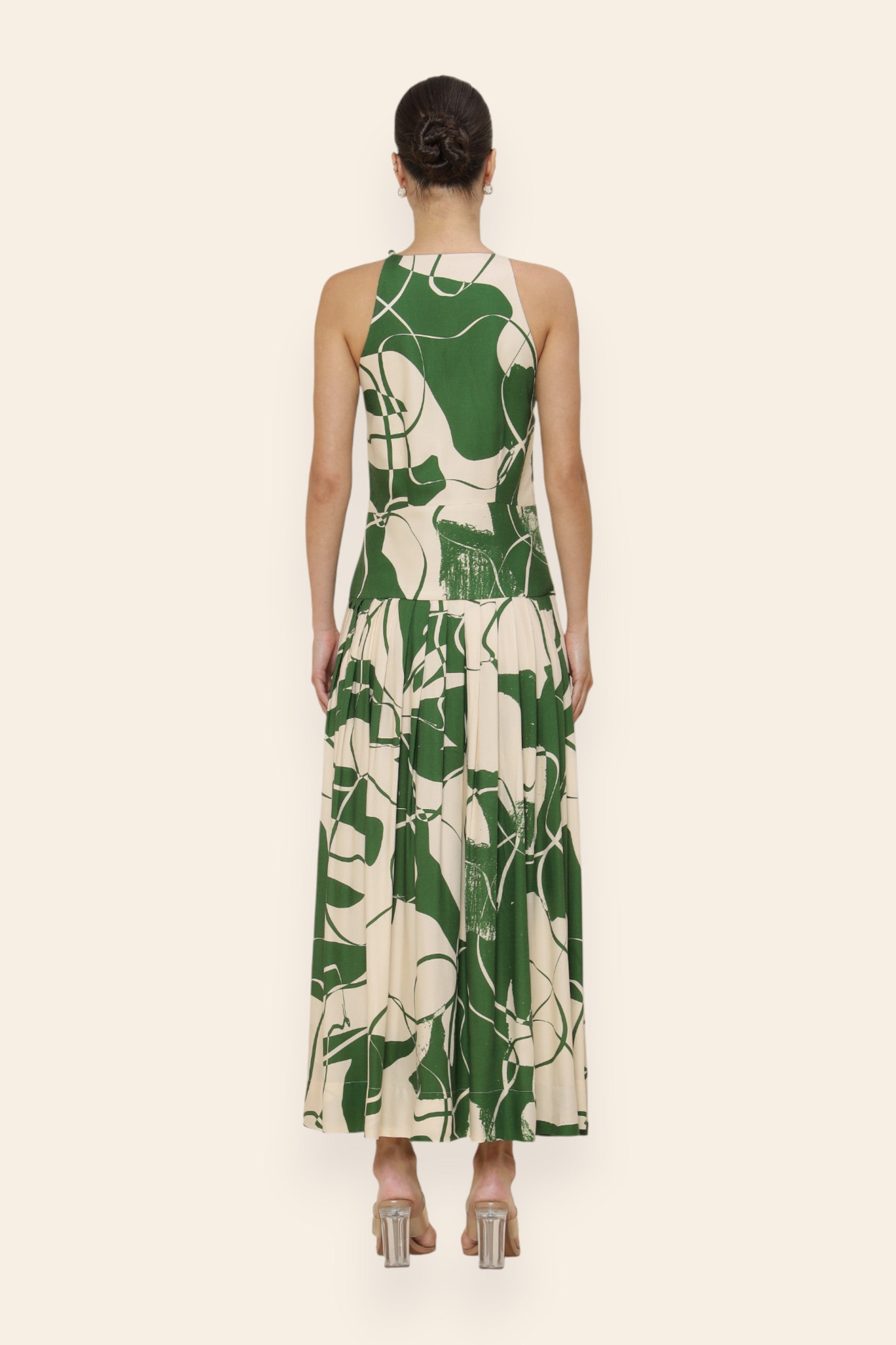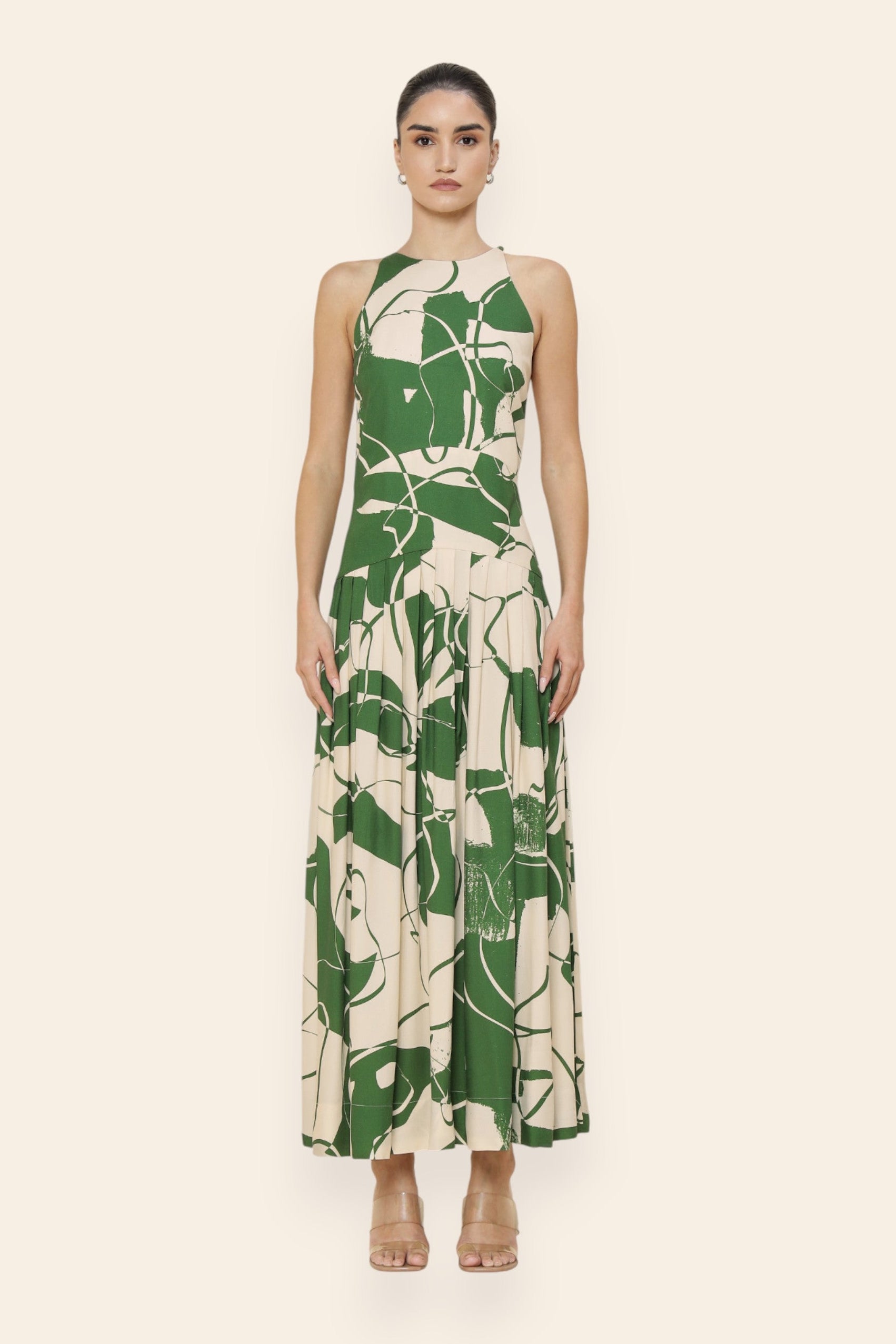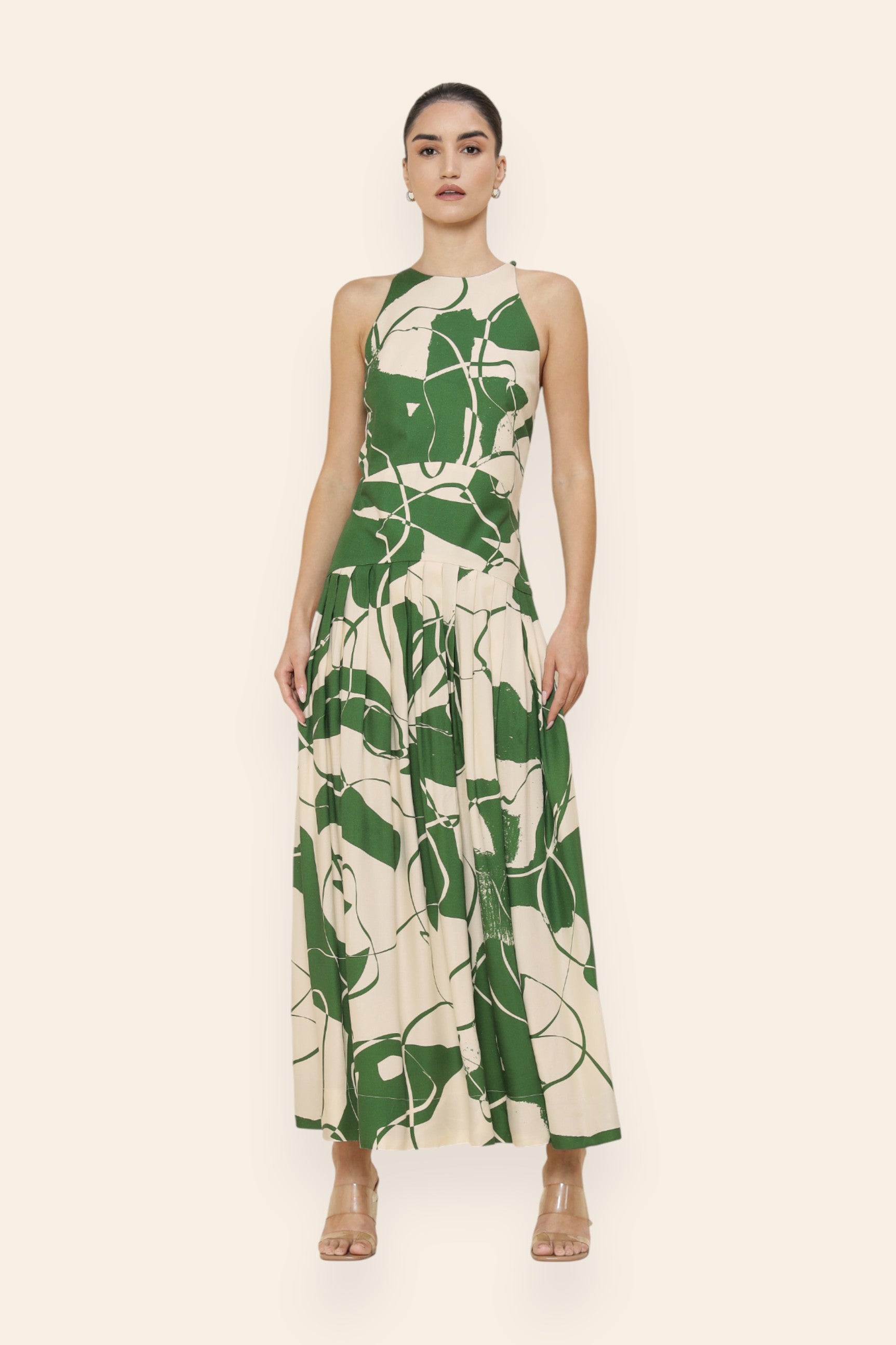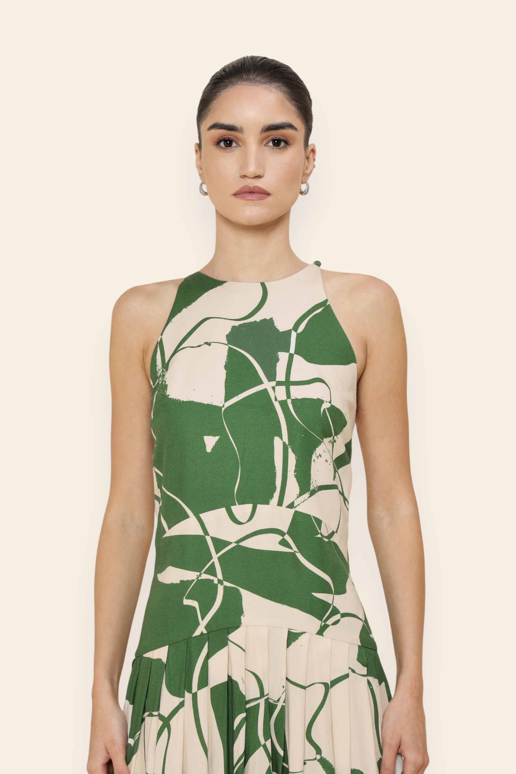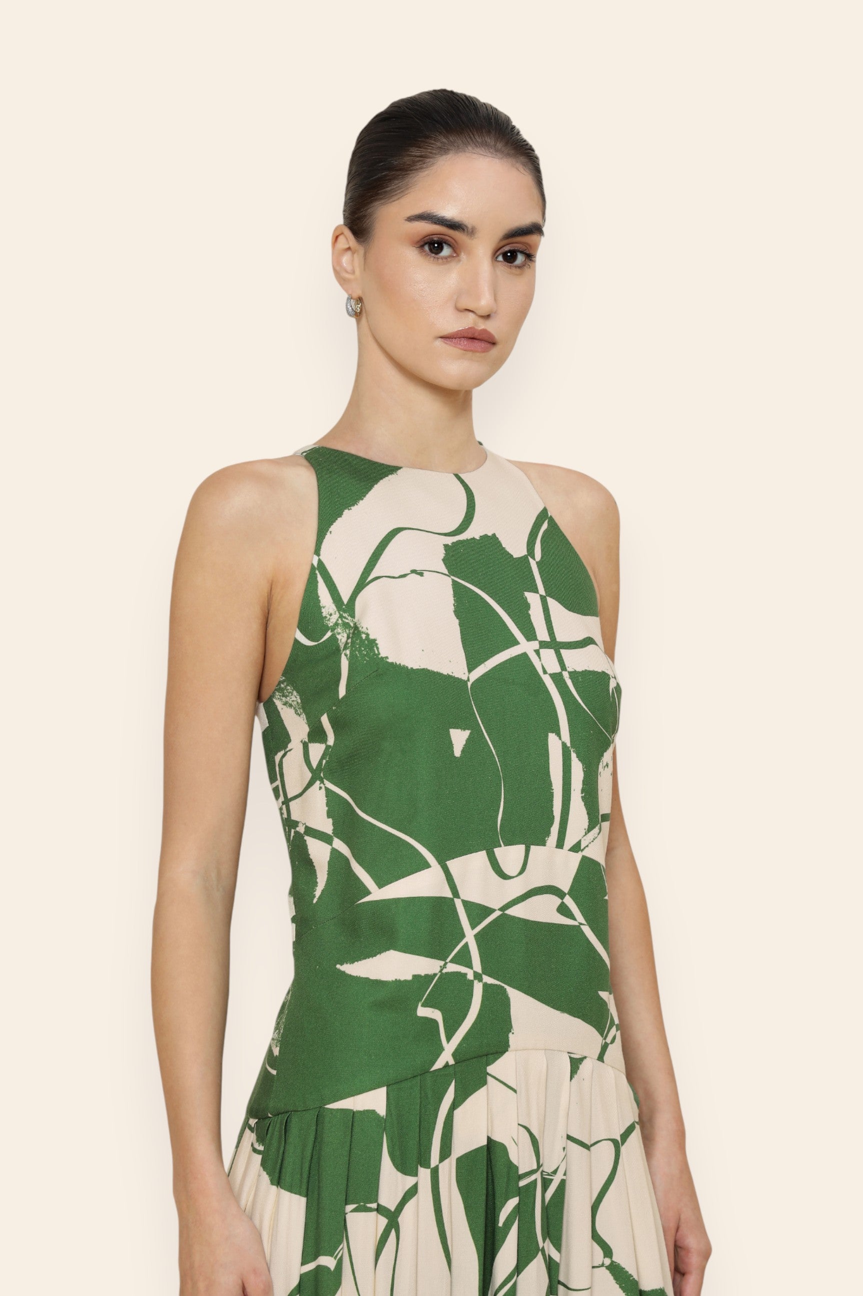 A statement of modern sophistication, this maxi dress is tailored to flatter with intent. The halter neckline creates a sleek, elongated line, while the fitted bodice sculpts the form. Box pleats from the hip bring fluidity and drama to the skirt. Curved seam detailing at the hip enhances the silhouette. Ideal for black-tie events, or elevated evening affairs.