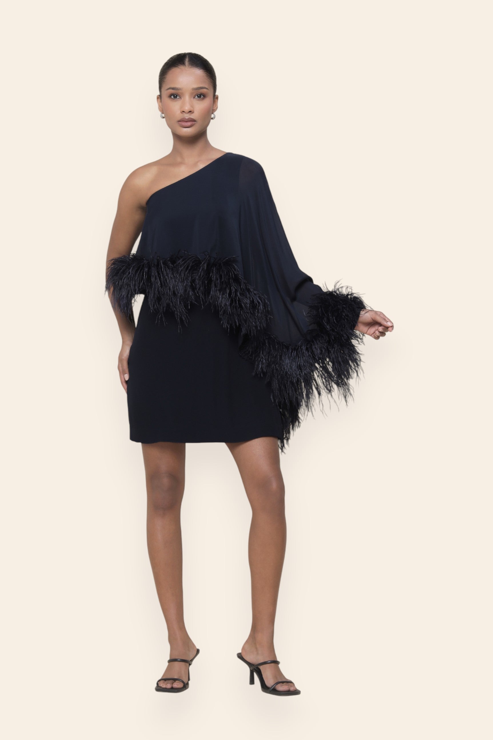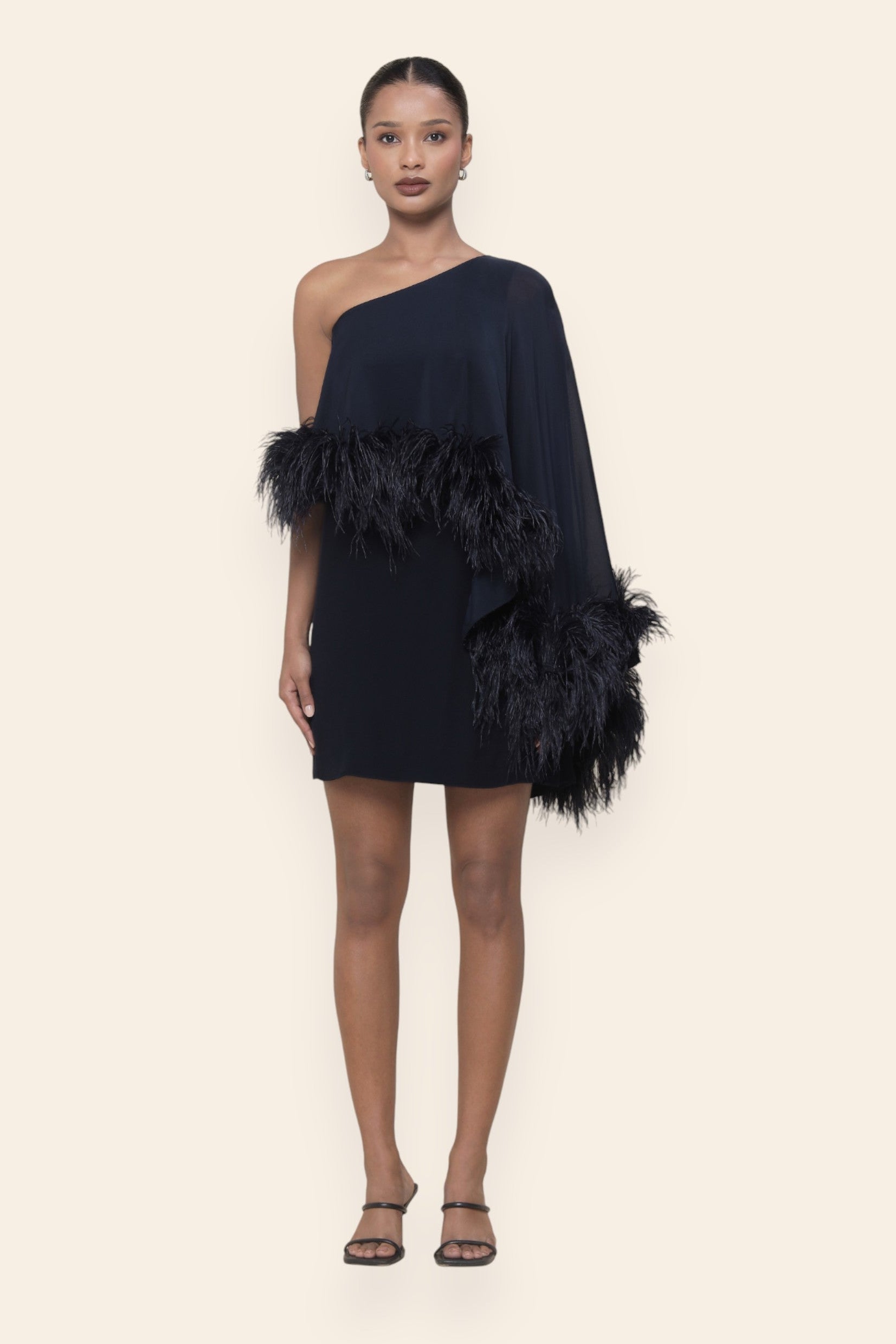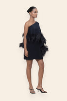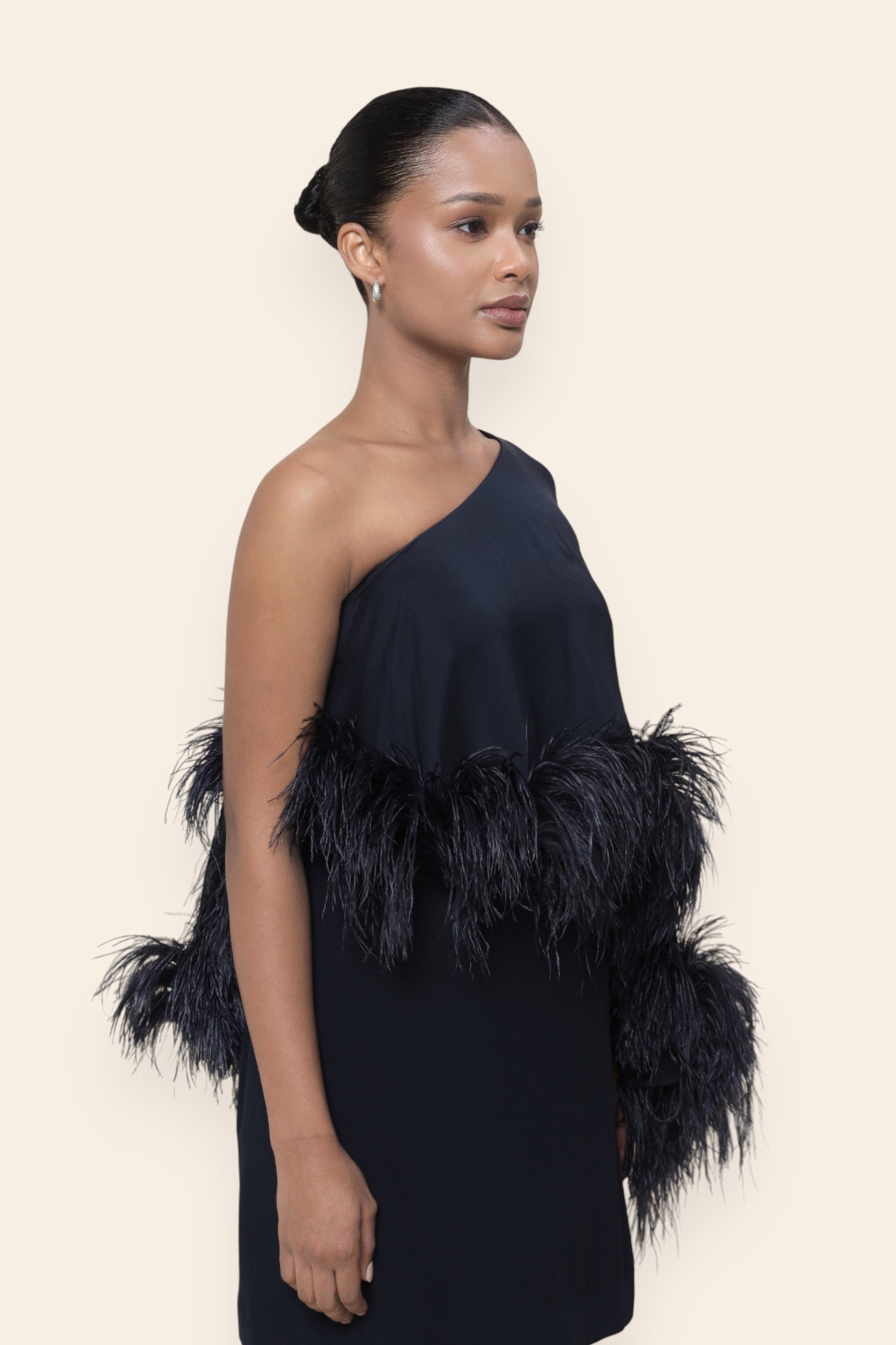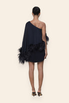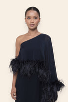 A study in sleek movement, this asymmetric cape dress is finished with feather trims that float with delicacy. Its one-shoulder silhouette makes it a refined choice for dinners, modern celebrations, and intimate luxury gatherings.